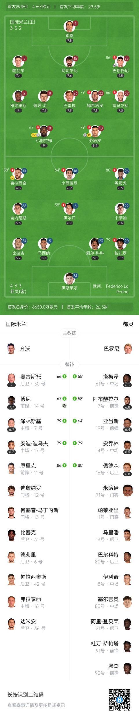 第18分钟巴斯托尼头球破门,巴雷拉助攻。此时比分变为国米1-0领先。↓